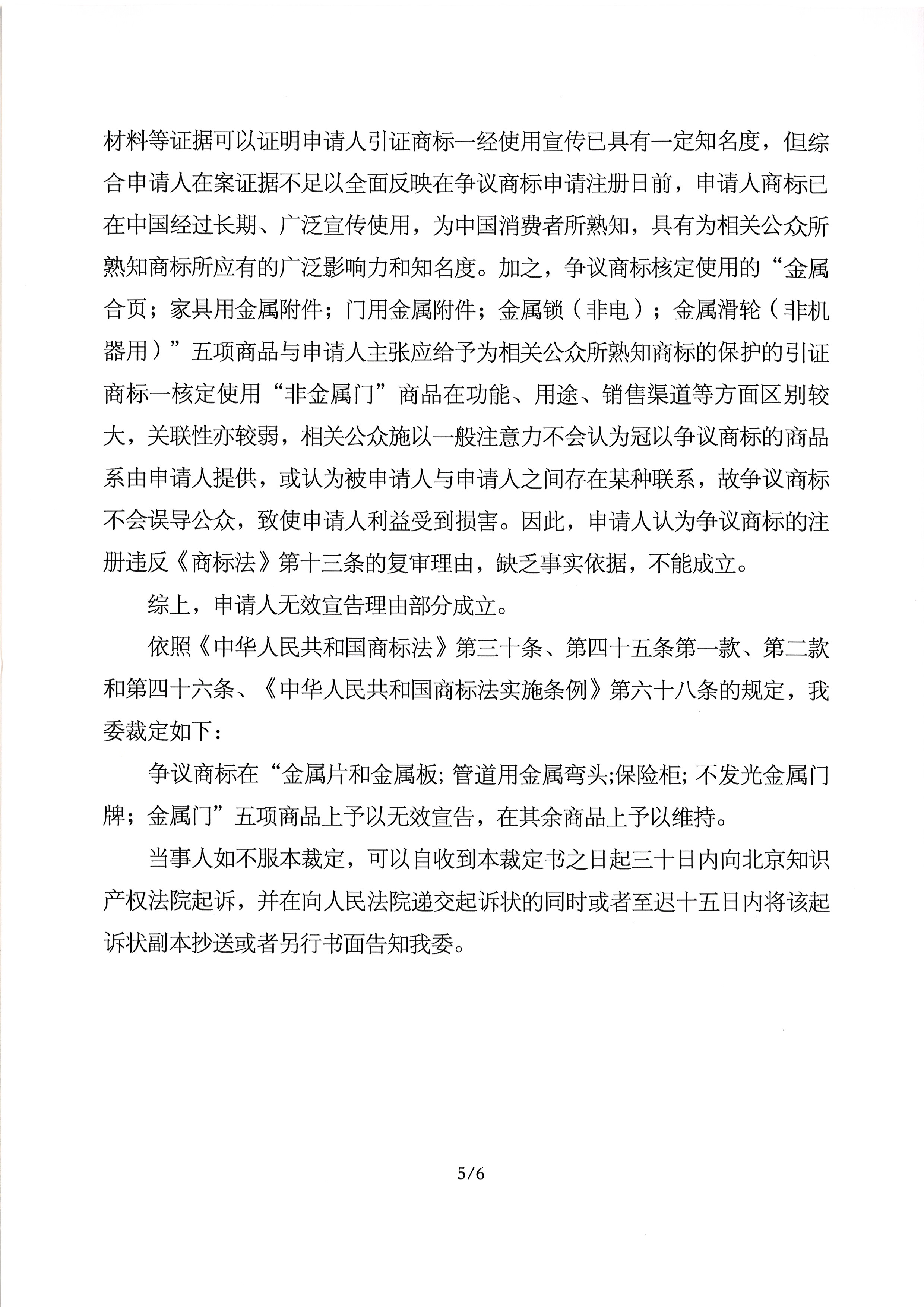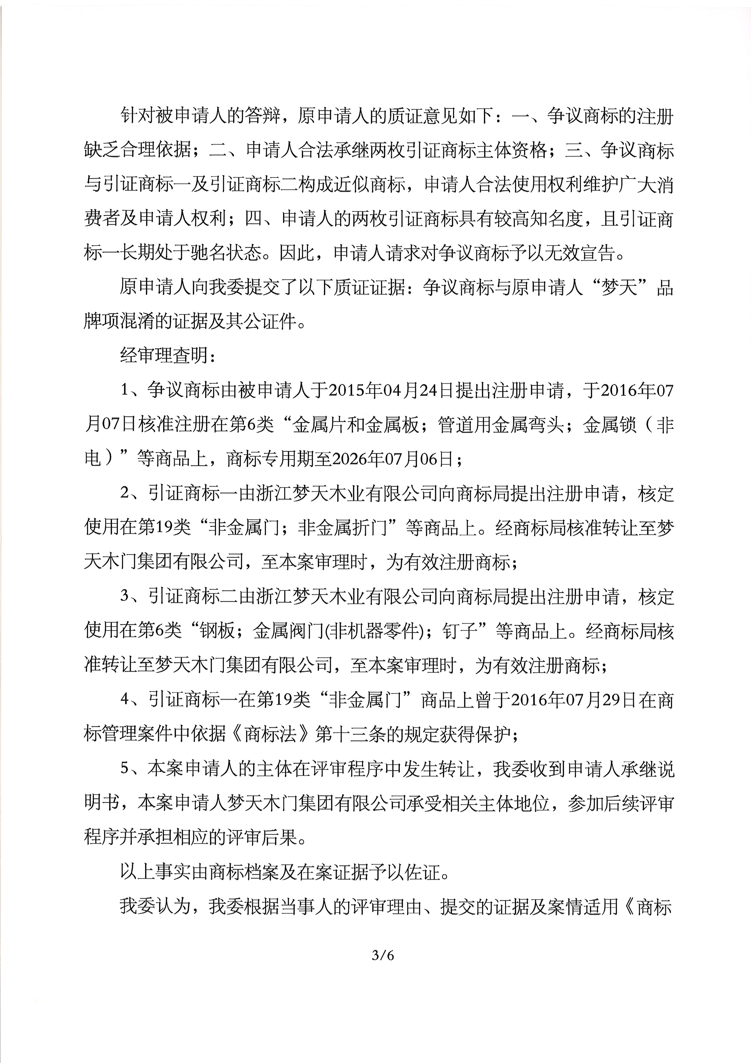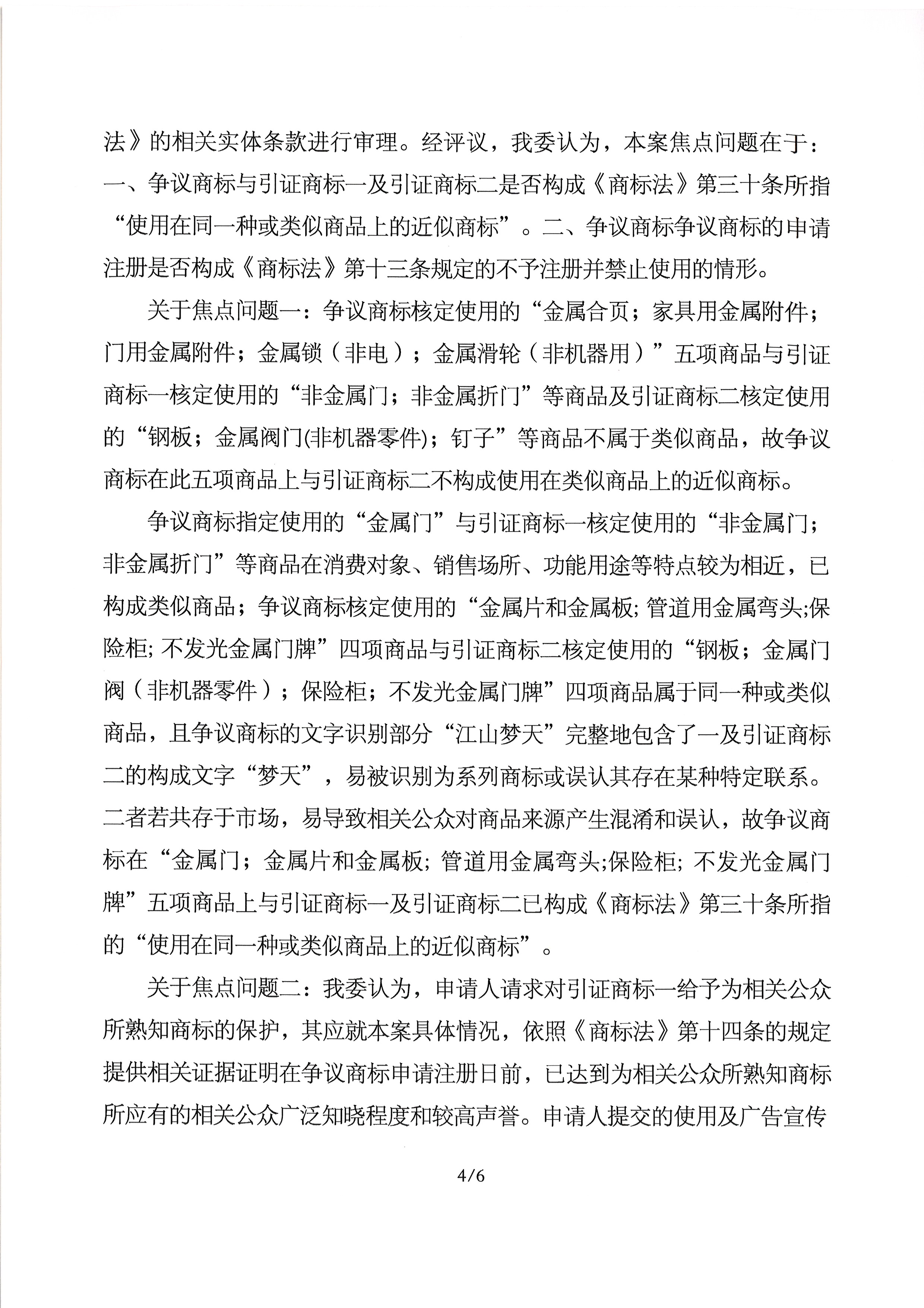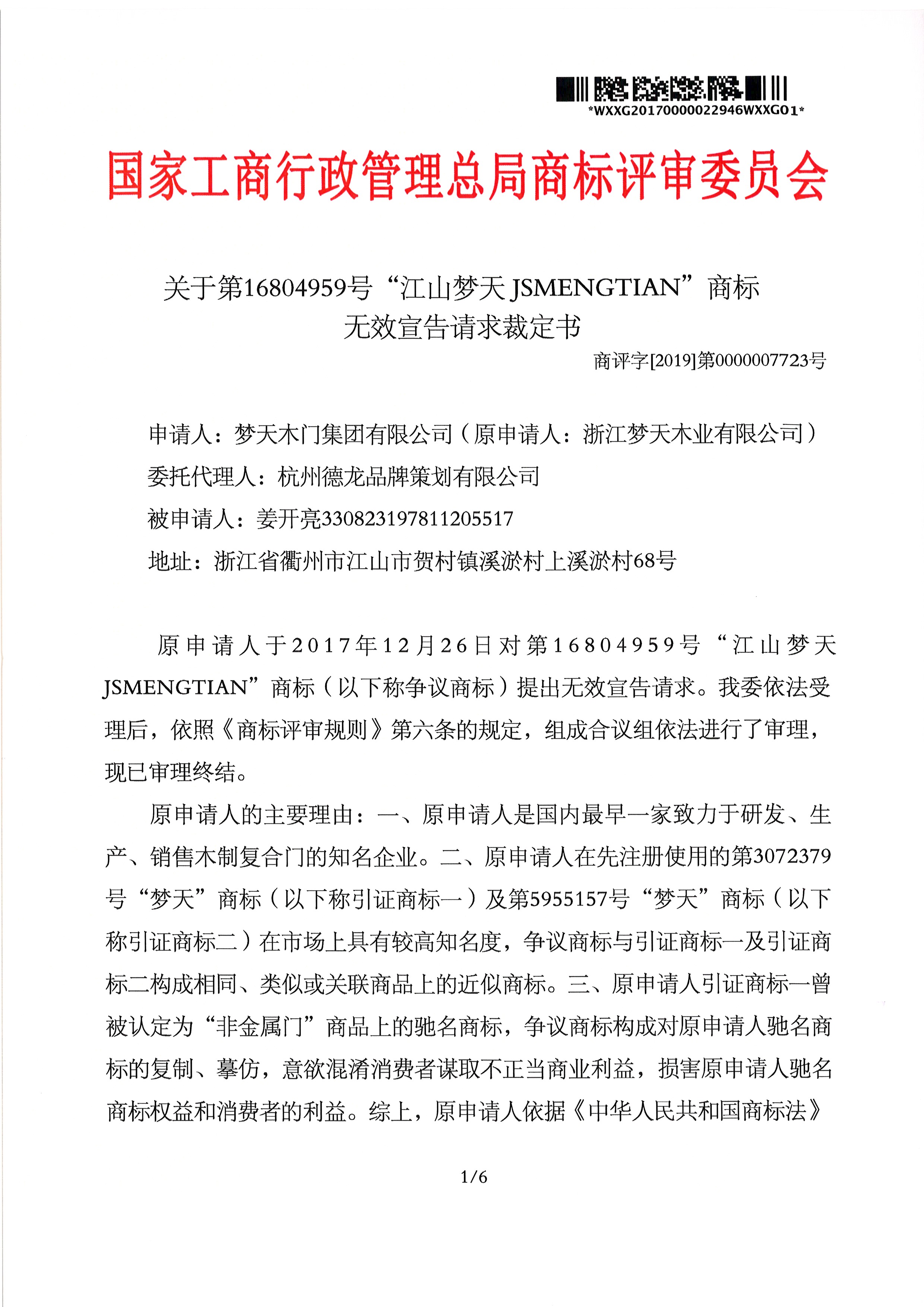 第6类第16804959号“江山梦天JSMENGTIAN”无效宣告裁定书
